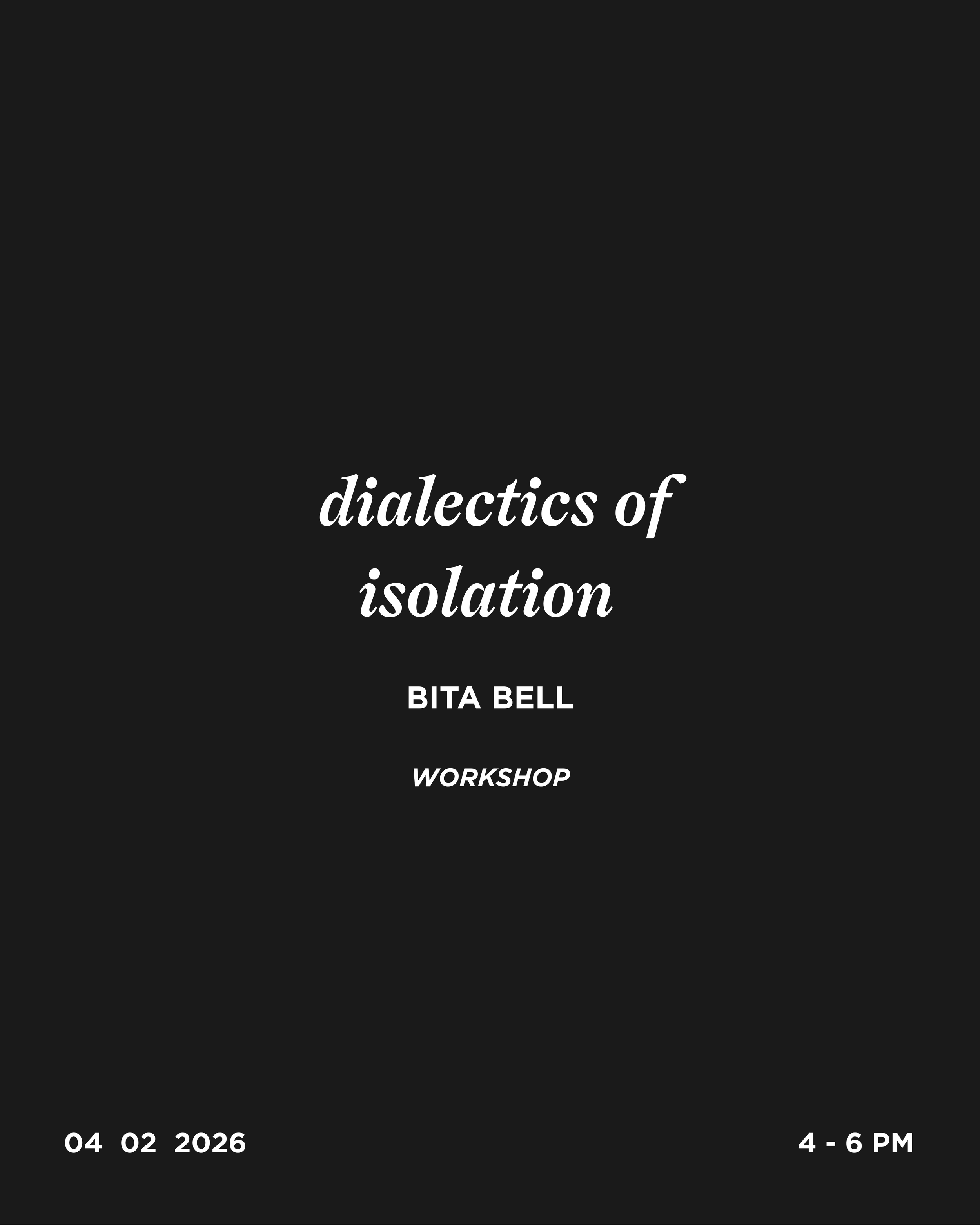 Bita Bell leads a movement workshop based on explorations from her upcoming group choreography project, Dialectics of Isolation. The session places somatic experience at the center of curiosity and treats the body as a site where feelings and relationships converge, inviting participants to sense how presence shapes the quality of movement, timing, and tone. Participants will be guided through breathing practices, movement improvisations, touch and contact, as well as embodied writing and vocalization.